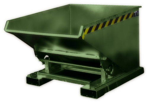 Der Kippvorgang wird bequem vom Fahrersitz aus per Zugseilentriegelung ausgelöst. Die Abrollkufen gewährleisten durch Ausnutzung des günstigen Lastenschwerpunktes eine sanftes Abkippen. Nach der Entleerung schwenkt der Kippbehälter automatisch wieder in die Ausgangsposition zurück und die Kippsicherung rastet wieder automatisch ein. Mit einer Sicherungskette an den Einfahrtaschen kann der Kippbehälter zusätzlich am Stapler gegen Abrutschen gesichert werden . Hohe Stabilität durch umlaufende gekantete Randverstärkung und stabilen Grundrahmen. Robuste Konstruktion aus Stahl mit Lackierung in RAL6011 Resedagrün. Zum einfachen Transportieren und Entleeren nehmen Sie den Kippbehälter einfach mit dem Stapler über die Einfahrtaschen auf und bringen ihn auf die gewünschte Position und erforderliche Höhe.