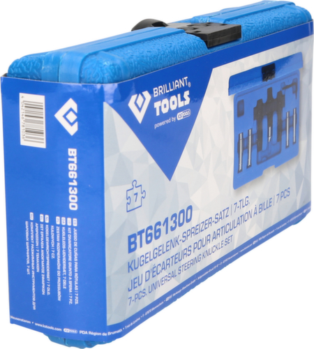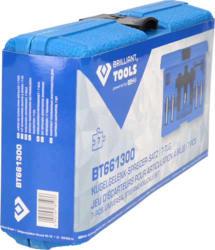 "longDescription": "<ul><li class=\"liste\">7-teiliger Satz</li><li class=\"liste\">zum Spreizen von z.B. Aluminium-/ Eisenguss-Achsschenkeln, bei Demontage und Montage der Stoßdämpfer</li><li class=\"liste\">durch das Spezial-Werkzeug vermeiden Sie das Schlagen auf die Bauteile und somit die Ermüdung und dadurch das Brechen des Materials</li><li class=\"liste\">passend z.B. für <strong>VW, Audi, BMW, Škoda, Seat, Peugeot, Renault, Citroën, Ford</strong> etc.</li></ul><br />Der BRILLIANT TOOLS Klemm und Spreizwerkzeug-Satz BT6613000 ist mit 2 wechselbaren Spreiz-Einsätzen (5 und 8 mm Tiefe) für unterschiedliche Spreizwinkel ausgestattet. Die Führungsbolzen (8, 10 und 12 mm) sind zum Beispiel für die Stoßdämpferaufnahme am Radlagergehäuse, beim Dämpferwechsel der Kugelgelenkaufnahme am Quer-/ Dreieckslenker, bei Demontage des Federbeines geeignet. Durch die optimale Fixierung des Werkzeuges mit Bolzen, die in die Schraubenlöcher gesteckt werden, ist ein Abrutschen nahezu unmöglich. Über eine Spindel mit 13 mm Außensechskant wird der Spreizer in die Öffnung gedrückt. Ein Schlagen mit Hammer ist nicht mehr nötig. Somit wird die Gefahr von Materialermüdung oder –bruch, gerade bei Alu-Lenkungsteilen, verringert.<br /><br />UNSERE QUALITÄT: BRILLIANT<br />UNSERE PREISE: SMART<br /><br />In jedem Werkzeug steckt mehr als ein viertel Jahrhundert Erfahrungen unserer Experten. Diese kompromisslose Qualität, Profi-Werkzeuge mit höchster Qualität für den harten Arbeitsalltag, ist eines der Erfolgsrezepte für uns. Wir verzichten auf eine große Vertriebsstruktur und extravagante Marketing-Aktivitäten und können Dir die Produkte daher zu einem sensationell günstigen Preis-/Leistungsverhältnis anbieten. Spare bares Geld ohne Deine Qualitätsansprüche herunterzuschrauben!<br /><br />Ein Qualitätswerkzeug powered by KS TOOLS.<br /><br>",
