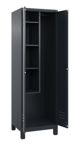 Die wichtigsten Details des C+P Putzmittelschrankes Classic Plus auf einen Blick:Über die Doppelflügeltür ist der Zugriff auf den Schrankinhalt besonders komfortabel. Die Lüftungsschlitze sorgen für eine erhöhte Belüftung und schützen somit den Inhalt des Schranks vor Feuchtigkeit und Schimmelbildung, da eine gute Luftzirkulation die Feuchtigkeit reduziert. Die innenliegenden Drehbolzen der einschlagenden Türen bieten den Vorteil einer sauberen Optik, da keine Schrauben oder Scharniere von außen sichtbar sind. Dadurch wird das Design des Schrankes nicht beeinträchtigt und das gesamte Möbelstück wirkt hochwertiger. Damit ist auch die glatte Oberfläche leichter zu reinigen, da keine Schmutz- oder Staubablagerungen an unzugänglichen Stellen zu befürchten sind. Jede Tür ist serienmäßig mit einer Anschlagsdämpfung ausgestattet, so dass, auch durch ein schwungvolles Schließen, die Tür nicht zuknallt. Das trägt nicht nur zu einer angenehmeren Geräuschkulisse bei, sondern schont auch den Stahlschrank vor Beschädigungen. 4 Ebene(n) mit Ablageboden. Die verkürzte Mitteltrennwand unterteilt den Schrank in zwei separate Bereiche, die auf verschiedene Arten und für unterschiedlich große Gegenstände genutzt werden können, lässt dabei im unteren Bereich jedoch Platz für Putzeimer oder andere Reinigungsgeräte. Links ausgestattet mit 4 Fächer mit festen Fachböden, rechts mit 1 stabile Garderobenstange aus Ovalprofil mit 4 verdrehsicheren Doppelschiebehaken. verschließbar mit Sicherheits-Drehriegel für Vorhängeschloss. Das Sicherheitsschloss ist besonders aufbruchsicher, da es im verschlossenen Zustand durchdreht und erst nach Entfernung des Schlosses einrastet. Türen gemeinsam verschließbar. Die zusätzlichen Lüftungsöffnungen im Abteil, kombiniert mit den Lüftungsschlitzen in der Tür, verbessern den Luftstrom. Dadurch wird der Schrankinhalt besser belüftet und trocknet schneller, ohne unangenehme Gerüche zu verursachen. Die untergebauten Füße aus Kunststoff verleihen dem Schrank nicht nur ein modernes und leichtes Erscheinungsbild und lassen ihn weniger massiv wirken, sondern bieten auch praktische Vorteile. Der offene Raum über dem Boden erleichtert die Reinigung und das Material Kunststoff bietet einen erhöhten Korrosionsschutz. Gerade in Umgebungen mit höheren Hygieneansprüchen ist dies ein wichtiger Aspekt. Korpus mit Einbrennlackierung in RAL7016 Anthrazitgrau. Front mit Einbrennlackierung in RAL7016 Anthrazitgrau.