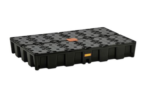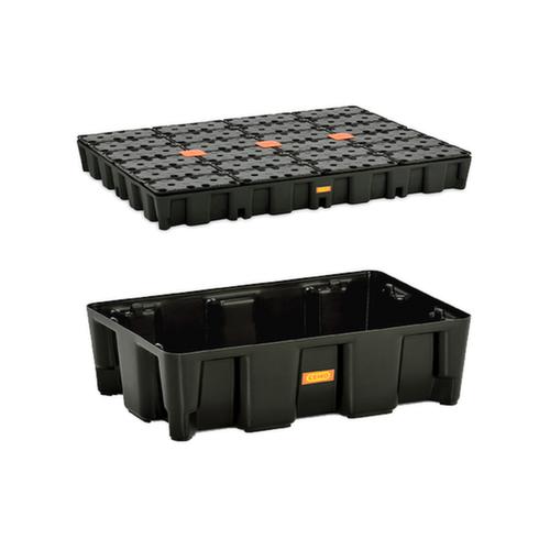 "description": "f. Kleingebinde, Auffangvol. 250l, HxBxT 180x1600x1200mm, m. Lochplatte PE, glatter Boden",