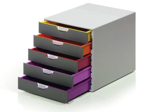 "longDescription": "<h2>Schubladenbox</h2><strong>klassisches Design mit modernem Touch</strong><br><ul><li><strong>Perfekt organisiert und alles griffbereit</strong> - mit feinen Farblinien bei geschlossenen Schubladen</li><li><strong>Individuell beschriftbar</strong> - inklusive Beschriftungsfenstern und auswechselbaren Einsteck-Etiketten</li><li><strong>Leicht und leise</strong> - geräuschfreie Schubladen mit Auszugssperre</li><li><strong>Stabil</strong> - aus Kunststoff</li><li><strong>Standfest</strong> - mit rutschfesten Füßen</li></ul><br>Ordnung schaffen mit System und Design! <br>Die Schubladenbox VARICOLOR® von Durable hilft nicht nur dabei noch mehr Ordnung zu schaffen, sie sieht dabei auch noch toll aus! Feine Farblinien an den Schubladen setzen sich von dem schlichten grauen Korpus ab. Damit überzeugt die Schubladenbox nicht nur optisch, sondern auch funktional! Denn die farbigen Linien helfen bei der besseren Orientierung und Organisation auf Ihrem Schreibtisch.<br><br>Die Schubladenbox besteht aus Kunststoff. Der Korpus ist einem hellen grau, die Schubladenfronten sind dunkelgrau. Von innen sind die Schubladen bunt. Die Farbe ist von außen bei geschlossenen Schubladen als dünne Linie zu erkennen. Jede Schublade ist in einer anderen Farbe, die durch die entsprechende Anordnung einen schönen Farbverlauf ergeben. So muss sich die Box nicht verstecken und kann auch gut sichtbar auf Ihren Schreibtisch stehen.<br><br>Die Schubladen sind für Formate bis DIN A4, C4 sowie Folio- und Letter-Size-Formate geeignet. Also passend für die gängigsten Papierformate im Büro.<br>Ordnung am Arbeitsplatz braucht auch Struktur! Für eine optimale Orientierung nutzen Sie doch einfach die beiliegenden Beschriftungsfenster. Diese sind mit leicht auswechselbaren Einsteck-Etiketten individuell zu beschriften. Auch eine Beschriftung mit dem Computer ist möglich. Damit wissen Sie und Andere genau, wo was zu finden ist.<br><br>Die Schubladen verfügen über einen geräuschfreien Leichtlauf. Kein Ruckeln an den Schubladen, keine störenden Geräusche mehr. Zudem ist die Schubladenbox mit einer Auszugssperre ausgestattet. So wird verhindert, dass die Schublade ausversehen komplett rausgezogen wird. Fast jeder kennt das Problem und das danach folgende Geduldsspiel, um die Schublade samt Inhalt wieder in die richtige Spur zu bekommen. Die Auszugssperre wird dies verhindern!<br><br>Auf der Unterseite der Schubladenbox befinden sich rutschfeste Füße aus Kunststoff. Dadurch steht sie sicher an ihrem Platz. Die Box ist deswegen auch stapelbar oder aber für Reihenaufstellung auf allen Sideboards und Büroschränken mit Standardmaße geeignet. Durch das elegante Design passt Schubladenbox nahezu in jedes Umfeld.<br><br>Sie können sich zwischen einer Box mit 5, 7 oder 10 Schubladen entscheiden. Oder Sie nehmen gleich mehrere mit unterschiedlicher Anzahl an Schubladen und stellen diese neben- oder aufeinander. Das ist deshalb so gut möglich, da die Schubladenboxen trotz unterschiedlicher Anzahl an Schubladen die gleichen Außenmaße haben.<br>",