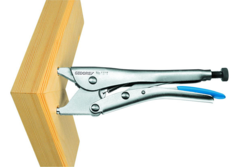 "longDescription": "Zum Spannen oder Fixieren von Längs- und Eckverbindungen, von extrem langen Sockeln und Blenden, Sturzbrettern, Handläufen, Blockrahmen, Beistößen, Bogenfenstern, Arbeitsplatten, Eckbänken usw., Auslösehebel blau tauchisoliert, Vernickelt, Die zu verleimenden Werkstücke zusammenfügen, bei geöffneter Zange die Bohrstellen mit den Spitzen der Spannzapfen markieren, die Löcher Ø 9-10 mm bohren, Leim beigeben, zusammenfügen, Zange einstecken, ausrichten, Spannhebel schließen - fertig!<br>",