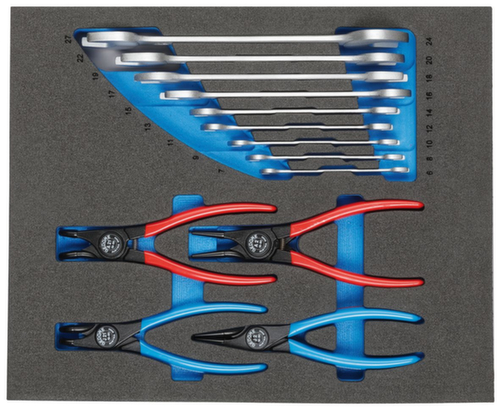 "longDescription": "Maße: 316,5 x 390 x 35 mm, Einfache optische Vollständigkeitsprüfung durch 2-farbige Schaumstoffeinlagen, Besonders geeignet für Arbeiten in sensiblen Bereichen, in denen sichergestellt werden muss, dass kein Werkzeug zurückbleibt, Unterlage blau, Oberlage schwarz. Die Farbe Blau signalisiert fehlendes Werkzeug, Das Werkzeug liegt verrutschsicher in seinem Nest und ist vor Beschädigungen geschützt, Griffmulden erleichtern das Herausnehmen des Werkzeuges, Deutlich sichtbare Werkzeugkonturen erleichtern das Zurücklegen in das richtige Nest, Resistent gegen Öle und Fette, Leicht zu reinigen mit Wasser, Seife und einer Hand-/Nagelbürste<br>",