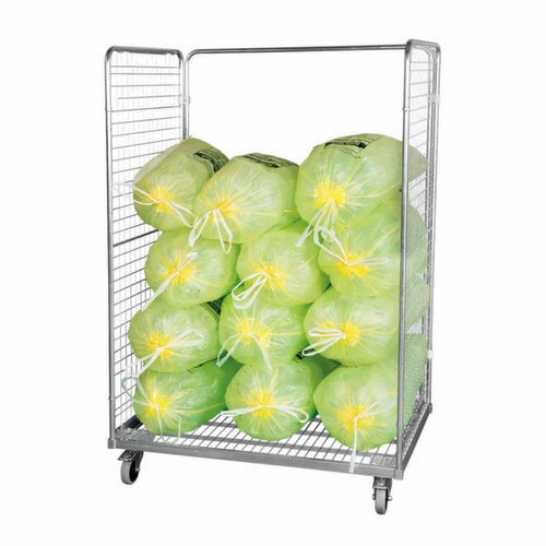 Aufbauten: 2 Wände (Drahtgitter). Im Euromaß. Konstruktion aus Stahl galvanisch blau verzinkt. Eine zusätzliche Stabilitätsstange macht den zweiseitigen Rollbehälter extra stabil. Plattform aus Drahtgitter. Leicht zu manövrieren und verfahren durch 4 Lenkrollen. Rad Ø 125 mm. Mit bodenschonender Elastik-Bereifung. Naben mit Kugellager. Die Feststeller an 2 Lenkrollen gewähren einen sicheren Stand.