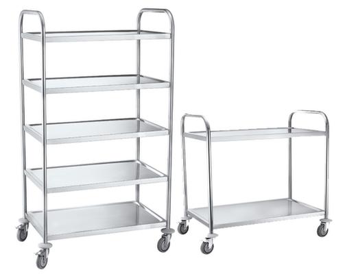 "description": "Tragl. 100kg, 2 Etage(n), m. Kunststoffmatten, Ladefl. LxB 820x500mm, Edelstahletage(n), Gummi-Bereifung",