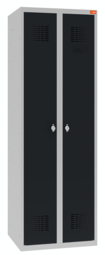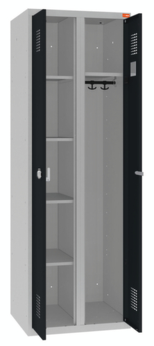 Links ausgestattet mit 4 Böden, rechts mit 1 Hutboden und Kleiderstange. Über die Doppelflügeltür ist der Zugriff auf den Schrankinhalt besonders komfortabel. Die aufschlagenden Türen bieten den Vorteil, dass es im Schrank keinerlei Platzverlust gibt, da sie innerhalb des Schrankes keinen Platz einnehmen. Verschließbar mit Drehriegelverschluss. Abteile gemeinsam verschließbar. Die standardisierte WEMO-Perforation sorgt für optimale Luftzirkulation im Schrank. Der untergebaute Sockel sorgt dafür, dass das Gewicht des Schrankes gleichmäßig auf dem Boden verteilt wird. Dies erhöht die Stabilität und der Schrank kann schwerer Lasten aufnehmen, als ein Schrank mit Füßen. Außerdem können Schmutz, Staub und Feuchtigkeit nicht unter den Schrank gelangen, was die Reinigungsfläche verkleinert. Konstruktion aus Stahlblech. Korpus mit korrosionsfester Zirkoniumbeschichtung in RAL7035 Lichtgrau, Front mit korrosionsfester Zirkoniumbeschichtung in RAL7016 Anthrazitgrau.