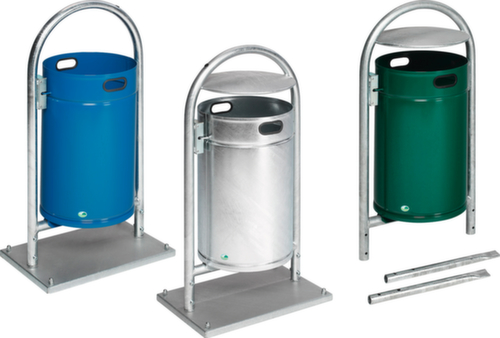 "longDescription": "<h2>Abfallbehälter mit Rohrbogenständer</h2><strong>formschön und robust für den Außenbereich</strong><br><ul><li><strong>Absolut wetterfest und langlebig</strong> - aus feuerverzinktem Stahlblech</li></ul><br><strong>Sie haben die Wahl:</strong><br><ul><li><strong>Schnelle oder extra standfeste Montage</strong> - zum Aufdübeln oder Einbetonieren</li><li><strong>Mit Regenschutz oder offen</strong> - mit oder ohne Schutzdach</li><li><strong>Mehr Farbe</strong> - zusätzlich mit Pulverbeschichtung</li></ul>",
